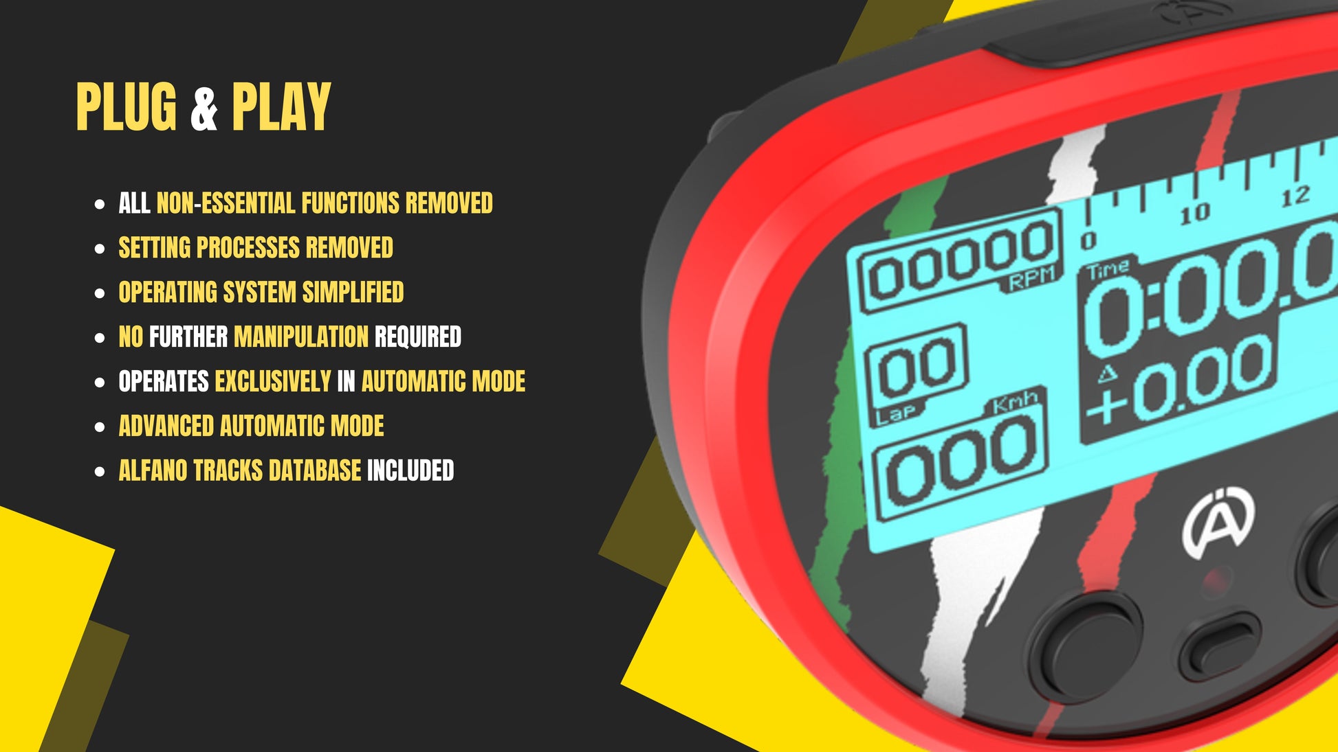 Robust, intuitive and highly accurate, the Alfano Legend is a dependable timing solution for drivers who want trusted data, effortless usability and outstanding value.